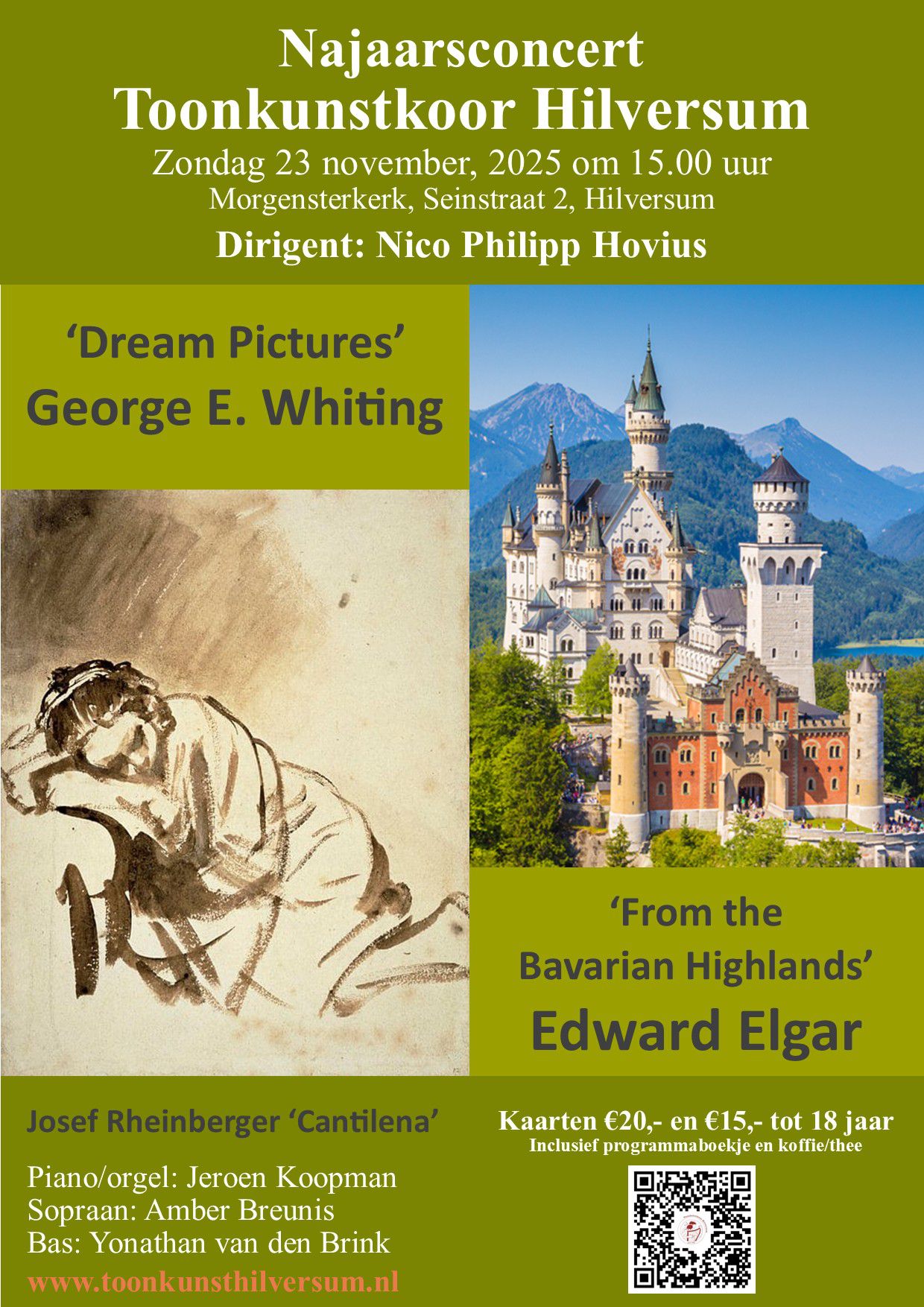 Op zondagmiddag 23 november wordt tijdens het najaarsconcert van het Toonkunstkoor Hilversum, naast de 'Bavarian Highlands' cyclus van Edward Elgar, ook de 'Dream Pictures' van Elgars tijdgenoot, de Amerikaanse componist George Whiting ten gehore gebracht. Voor de gemiddelde liefhebber van koormuziek vermoedelijk een eerste kennismaking.